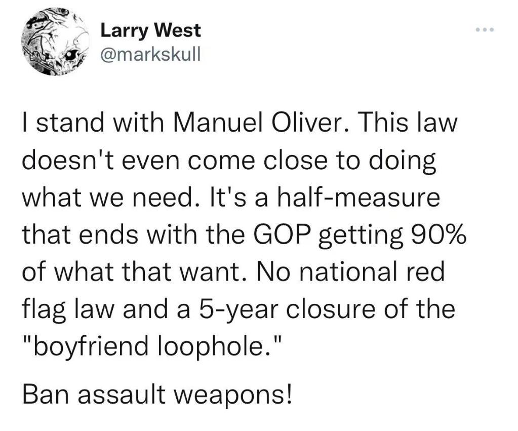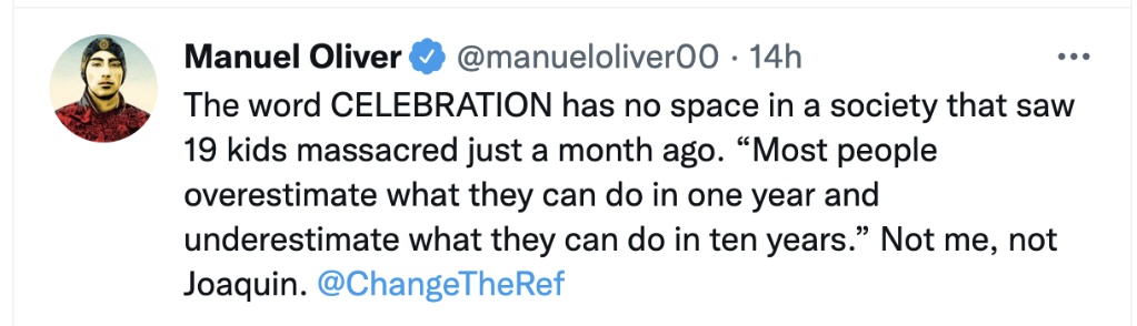 奧利弗的社交媒體賬號至今仍以兒子的肖像作為頭像。就在應邀出席白宮這場“慶功會”前,他在社交媒體上發(fā)文說:“美國一個多月前才發(fā)生了一場造成19個孩子遇害的槍擊慘案,現(xiàn)在可不應該使用‘慶?!@個詞?!?/strong>