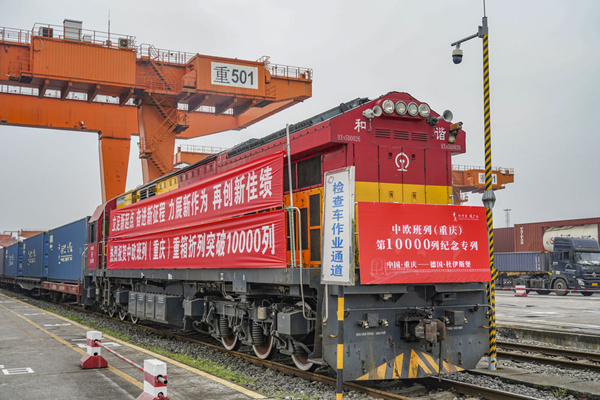 7月11日,中國首條中歐班列線路中歐班列(重慶)第10000列重箱折列接車儀式在德國杜伊斯堡市DIT場站舉行。