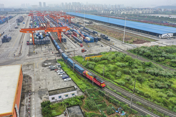 ↑6月23日,中歐班列(重慶)第10000列列車在重慶團結(jié)村中心站順利駛出(無人機照片)。新華社記者 黃偉 攝