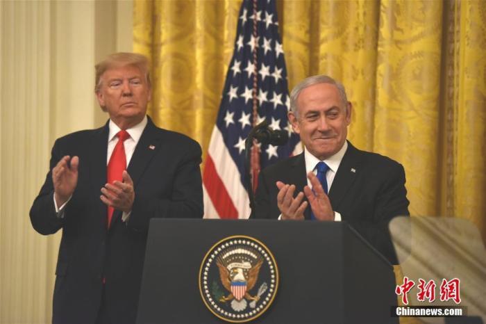 資料圖:2020年1月28日,美國前總統(tǒng)特朗普和以色列前總理內(nèi)塔尼亞胡在白宮舉行聯(lián)合發(fā)布會,宣布所謂推動解決巴勒斯坦與以色列問題的“世紀協(xié)議”。巴勒斯坦方面此前已表示,該協(xié)議違反國際法,呼吁國際社會予以拒絕。 中新社記者 陳孟統(tǒng) 攝