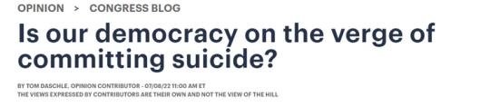 美國國會山網(wǎng)站當?shù)貢r間7月8日發(fā)表了一篇題為《我們的民主處在自殺邊緣嗎?》的文章, 作者美國前參議員湯姆·達施勒(Tom Daschle)表示, 6月最高法院關(guān)于婦女墮胎權(quán)的判決讓他想起了約翰·亞當斯的預言。他直言不諱地說,美國一直在濫用和耗盡寶貴的民主。現(xiàn)在,民主正處于自殺的邊緣。