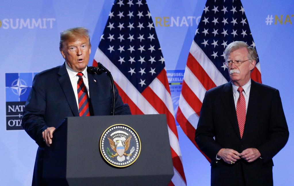這張2018年7月12日拍攝的資料照片顯示,美國時任總統(tǒng)特朗普(左)和時任總統(tǒng)國家安全事務助理博爾頓在比利時首都布魯塞爾出席北約峰會。新華社記者葉平凡攝