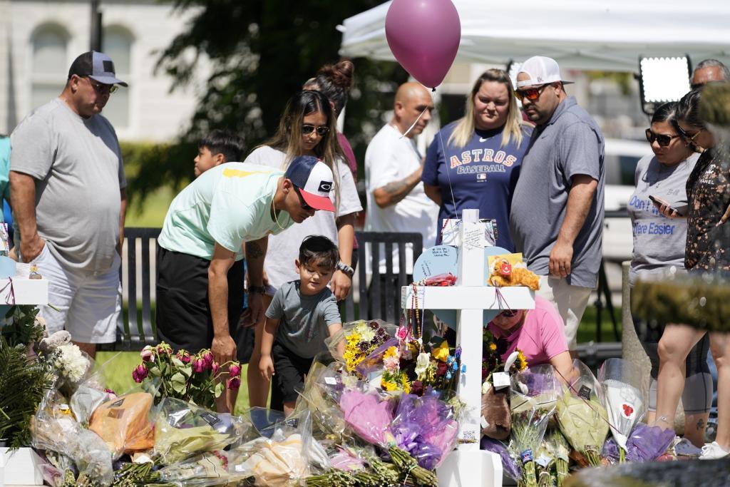 5月27日,在美國得克薩斯州南部尤瓦爾迪市的城市廣場(chǎng),市民哀悼羅布小學(xué)槍擊事件遇害者。新華社記者吳曉凌攝