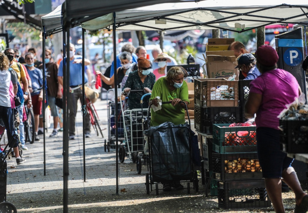 2020年8月8日,人們在美國紐約街頭的免費食物發(fā)放點領(lǐng)取食物。新華社記者王迎攝