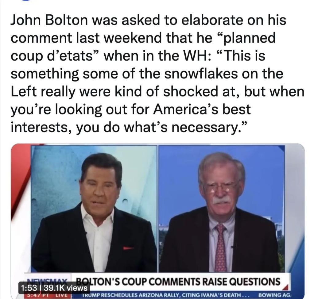 如今博爾頓的表態(tài)可謂直白,說起策劃政變時毫無遮掩。顯然,“策劃政變”對這名美國知名鷹派人物來說已經(jīng)是輕車熟路。