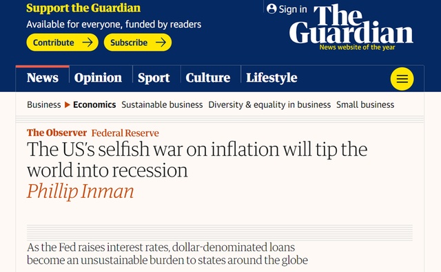 英國(guó)《衛(wèi)報(bào)》7月16日發(fā)文抨擊美國(guó)自私的行為將使世界陷入經(jīng)濟(jì)衰退。文章稱,隨著美聯(lián)儲(chǔ)加息,以美元計(jì)價(jià)的債務(wù)成為全球各國(guó)難以承受的負(fù)擔(dān)。