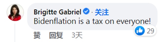 美國(guó)保守派作家、活動(dòng)家布里吉特·加布里埃爾(Brigitte Gabriel)在臉書(Facebook)上評(píng)論指出,“拜登通脹(Bidenflation)”是在向每個(gè)人收稅。