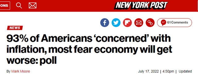 美國(guó)《紐約郵報(bào)》7月17日?qǐng)?bào)道稱,??怂剐侣勗?7 月 10 日至 13 日期間對(duì)1001名登記選民進(jìn)行了調(diào)查。該民意調(diào)查顯示,高達(dá)93%的民眾“擔(dān)憂”當(dāng)前通脹水平。他們對(duì)9.1%的通脹率感到悲觀,其中高達(dá)67%的人感到“極度”悲觀。當(dāng)被問及對(duì)未來經(jīng)濟(jì)的預(yù)期時(shí),52%的人預(yù)測(cè)明年的情況將會(huì)更糟。