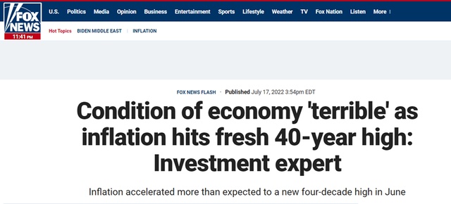 國(guó)際在線專稿:美國(guó)勞工部7月13日公布的數(shù)據(jù)顯示,美國(guó)6月消費(fèi)者物價(jià)指數(shù)(CPI)同比增長(zhǎng)9.1%,遭遇40年來最嚴(yán)重通脹。海外媒體與學(xué)者普遍認(rèn)為美國(guó)當(dāng)前經(jīng)濟(jì)狀況“非常糟糕”,并對(duì)其可能給世界經(jīng)濟(jì)造成的負(fù)面影響表示憂慮。海外網(wǎng)友們也紛紛在社媒平臺(tái)發(fā)表評(píng)論,批評(píng)美國(guó)政府管理不力、推卸責(zé)任,“太令人失望”。