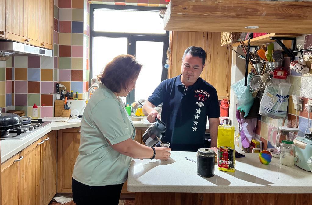 克里斯蒂安·阿卡爾在位于遼寧省大連市甘井子區(qū)的家中和妻子一起準(zhǔn)備阿根廷下午茶。新華社記者 趙洪南 攝
