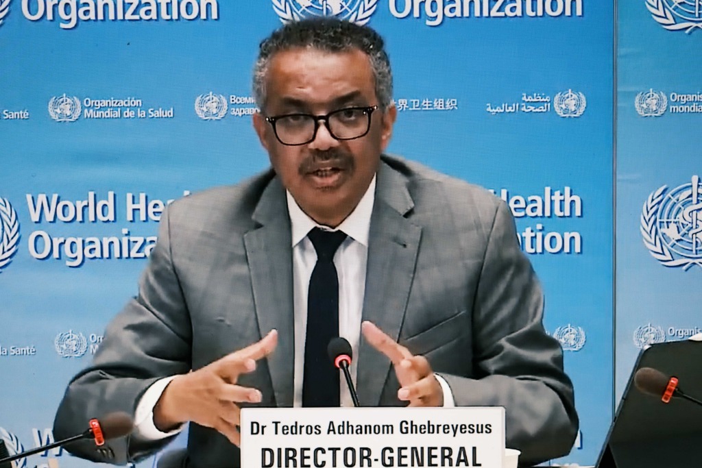 2020年8月6日在比利時布魯塞爾拍攝的世界衛(wèi)生組織總干事譚德塞在瑞士日內(nèi)瓦出席線上記者會的視頻畫面。新華社記者張鋮攝