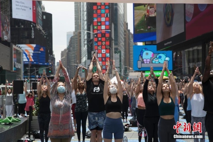 當(dāng)?shù)貢r(shí)間6月21日,民眾在美國(guó)紐約時(shí)報(bào)廣場(chǎng)做瑜伽迎接夏至到來。 中新社記者 廖攀 攝