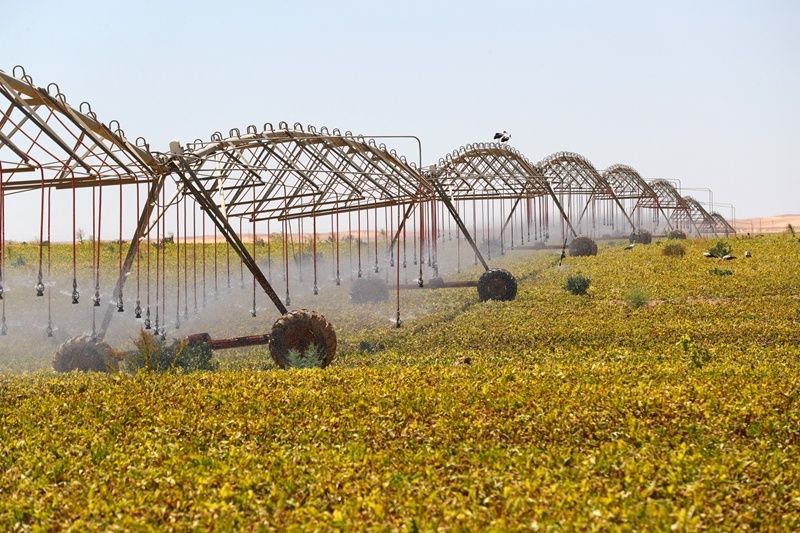 ↑7月11日,在埃及明亞省沙漠里的甜菜種植農(nóng)場,自動噴灌機給甜菜澆水。新華社記者 隋先凱 攝
