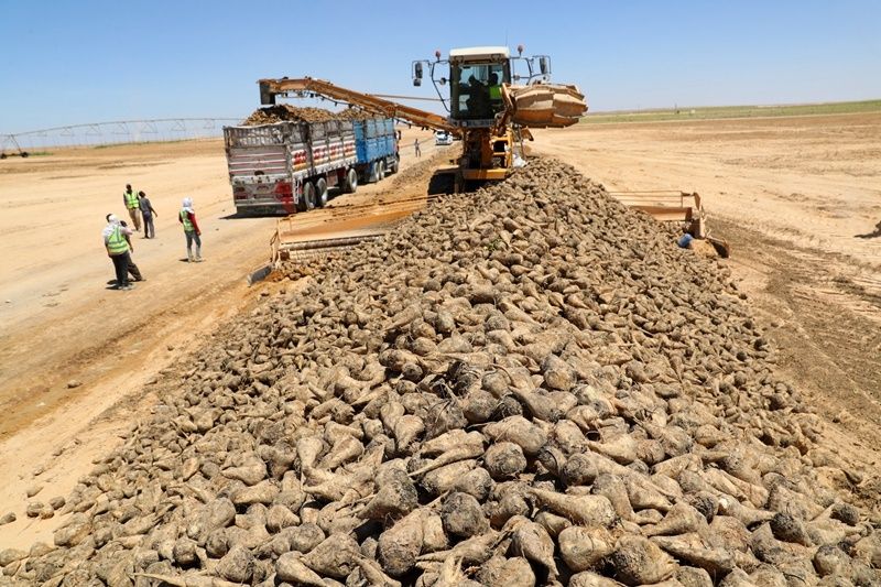 ↑7月11日,在埃及明亞省沙漠里的甜菜種植農(nóng)場,工作人員將收獲的甜菜裝車。新華社記者 隋先凱 攝
