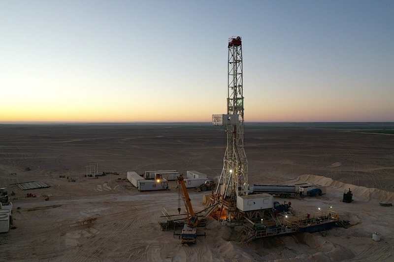 ↑這是2021年2月2日在埃及明亞省沙漠里的種植農(nóng)場拍攝的中國中曼公司打井平臺(無人機照片)。新華社發(fā)(中曼公司供圖)