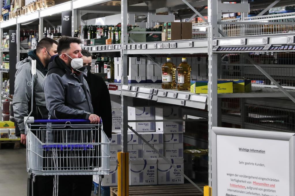 3月26日,在德國首都柏林的一家超市,顧客站在商品短缺的食用油貨架前。隨著西方不斷升級對俄制裁,能源價格上漲也波及食品、日用品等與生活息息相關(guān)的領(lǐng)域。新華社記者單宇琦攝