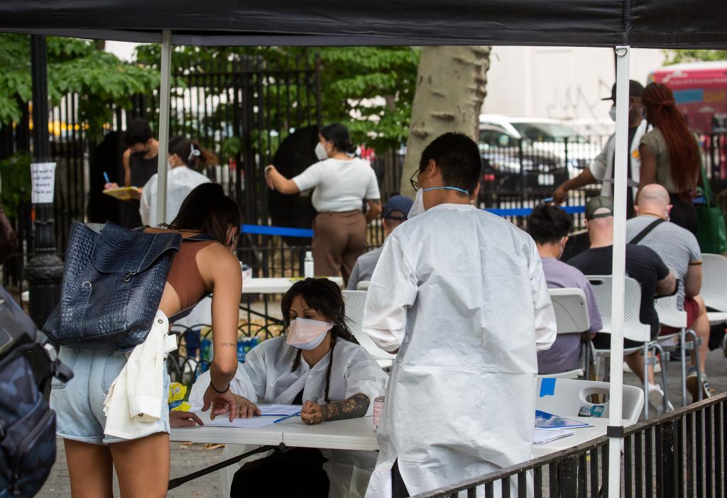 7月14日,人們在美國紐約一處疫苗接種點等待接種猴痘疫苗。新華社發(fā)(郭克攝)