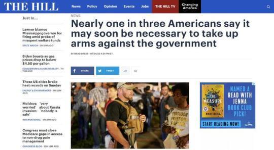 報道大量例舉該民調的“驚人”數(shù)據(jù):僅有33%的親共和黨受訪者認可美國大選結果公正準確;全體受訪對象中,認為“很快美國公民將有必要武裝起來對抗政府”的人占據(jù)28%,而其中的槍支持有者占37%。超半數(shù)民主黨人和約三分之二的共和黨與獨立派人士相信“政府是腐敗的”,而近四分之一的美國人表示曾由于政治爭端而與朋友決裂。