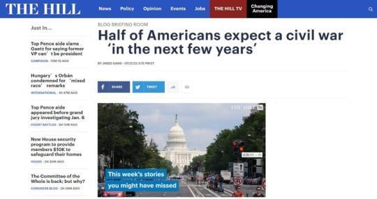 上周,《國會山報》網站還就另一項國會山騷亂事件聽證會期間進行的調查研究發(fā)表報道。報道指出,來自加利福尼亞大學戴維斯分校的研究團隊報告稱,超過50%的問卷調查受訪者或多或少贊同“美國很快將陷入一場內戰(zhàn)”。研究人員強調,該調研產生于國會山騷亂事件首輪最后一場聽證會開幕之前,展示了民眾對美國民主的未來深感憂慮的現(xiàn)狀。