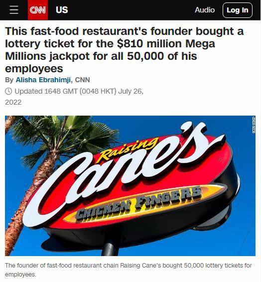 中新網(wǎng)7月27日電 據(jù)美國(guó)有線電視新聞網(wǎng)(CNN)報(bào)道,當(dāng)?shù)貢r(shí)間26日,美國(guó)彩票“超級(jí)百萬”(Mega Millions)的頭獎(jiǎng)飆升至8.1億美元,引發(fā)全美各地彩民爭(zhēng)相購買,快餐連鎖店Raising Cane的創(chuàng)始人格雷夫斯(Todd Graves)也是其中之一。