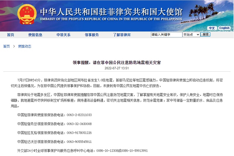 人民網(wǎng)訊 據(jù)中國駐菲律賓大使館網(wǎng)站消息,7月27日8時43分,菲律賓呂宋島北部地區(qū)阿布拉省發(fā)生7.0級地震,首都馬尼拉等地區(qū)震感強烈。中國駐菲律賓使館立即啟動應(yīng)急機制,將密切關(guān)注后續(xù)情況,為在菲中國公民提供領(lǐng)事保護和協(xié)助。目前,未接到有中國公民在地震中傷亡的報告。
