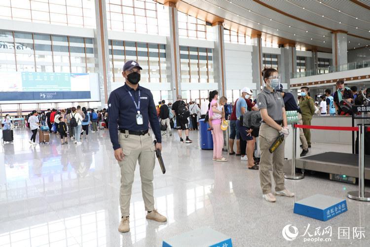 負(fù)責(zé)中老鐵路場(chǎng)站安保的先豐公司保安在車站執(zhí)勤。記者 孫廣勇攝 |