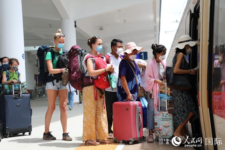 在瑯勃拉邦站乘坐中老鐵路旅行的外國(guó)游客。記者 孫廣勇攝 |