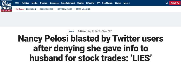 佩洛西否認對丈夫透露股票交易內(nèi)幕后,網(wǎng)友指責(zé)其撒謊。圖片來源:美國福克斯新聞網(wǎng)報道截圖