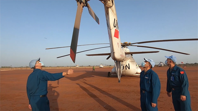 飛行前機(jī)組對(duì)直升機(jī)進(jìn)行檢查。維和直升機(jī)分隊(duì)供圖 |