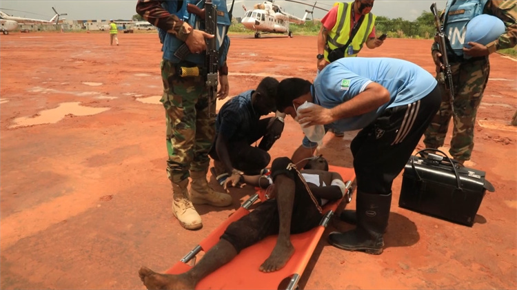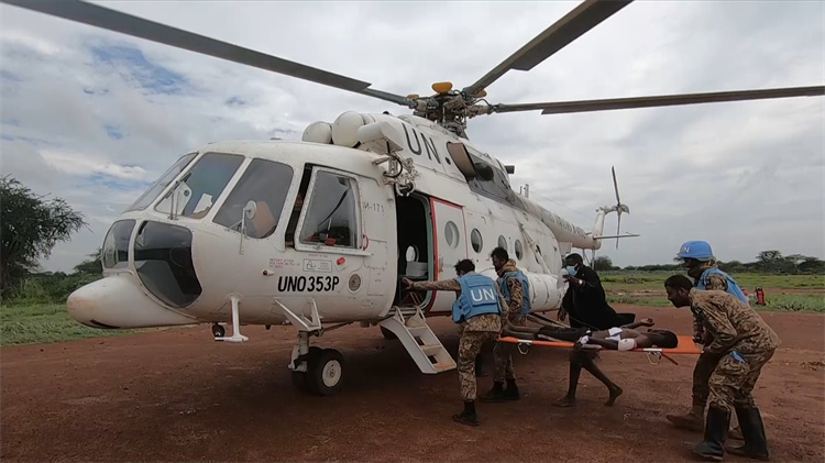 運(yùn)送重傷員上飛機(jī)。維和直升機(jī)分隊(duì)供圖 |