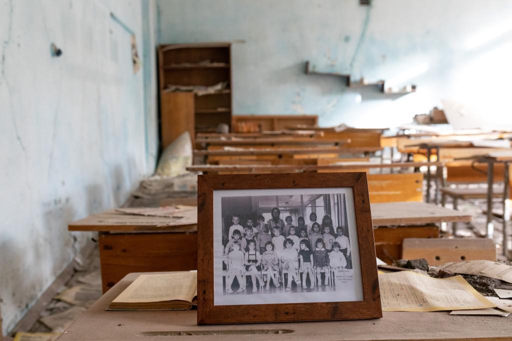 2019年11月12日,在烏克蘭北部切爾諾貝利核電站附近的普里皮亞季城,一張集體合影被擺放在廢棄的教室內(nèi)。新華社記者白雪騏攝