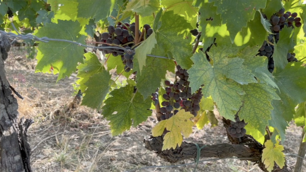 這座農場主要種植葡萄、油橄欖和當季蔬菜等作物,同時生產葡萄酒和橄欖油等農產品。走進烈日炙烤下的葡萄園,這里的土壤呈淺黃色,一些地方甚至已經(jīng)開裂,不少葡萄果實的表皮長出了“皺紋”,汁水難以稱得上充足。