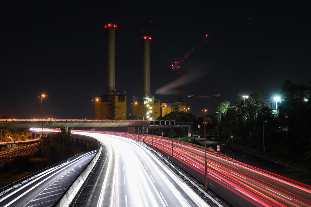這是2021年10月8日在德國首都柏林拍攝的一座正在拆除煙囪的熱電廠。新華社記者單宇琦攝