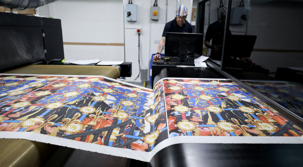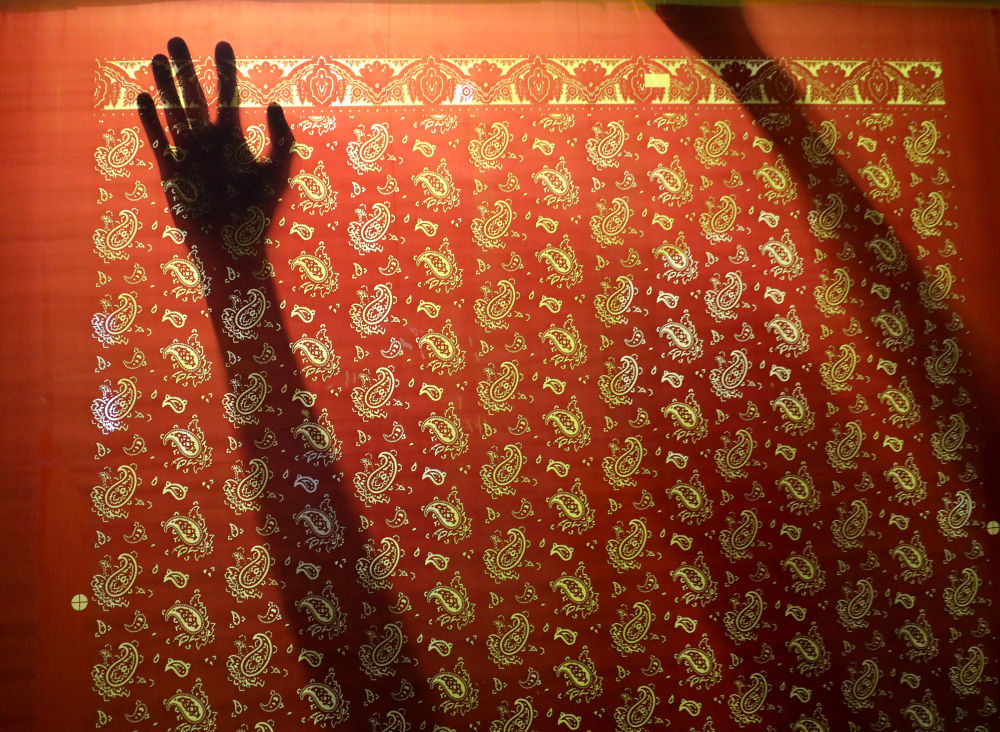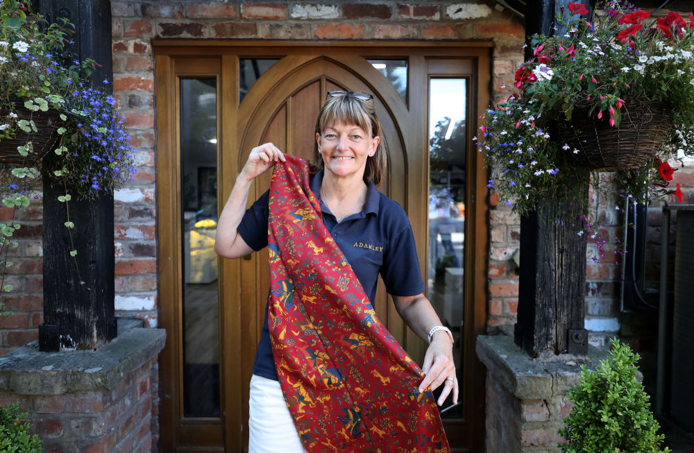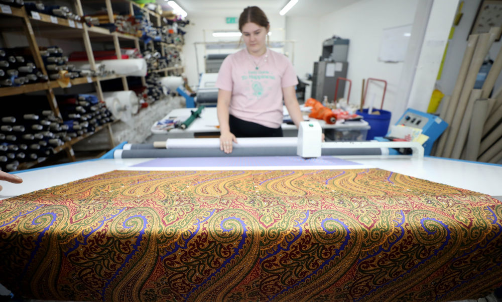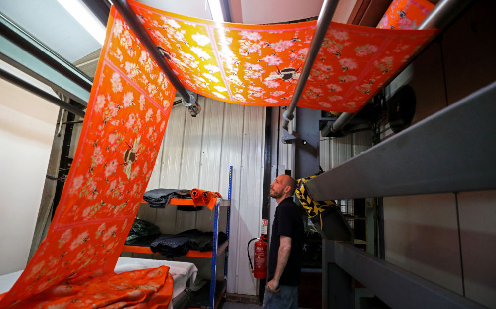 ↑8月11日,在英國麥克爾斯菲爾德一家絲綢工廠,工作人員展示絲綢產(chǎn)品。