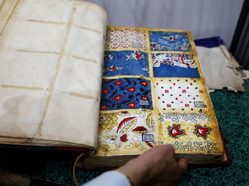 ↑8月11日,在英國麥克爾斯菲爾德一家絲綢工廠,工作人員展示有關(guān)絲綢的古代書籍。
