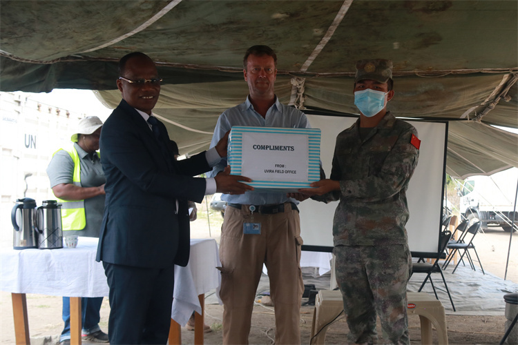聯(lián)剛穩(wěn)定團(tuán)工作人員向我維和官兵贈(zèng)送禮物。中國(guó)第25批赴剛果(金)維和工兵分隊(duì)供圖 |