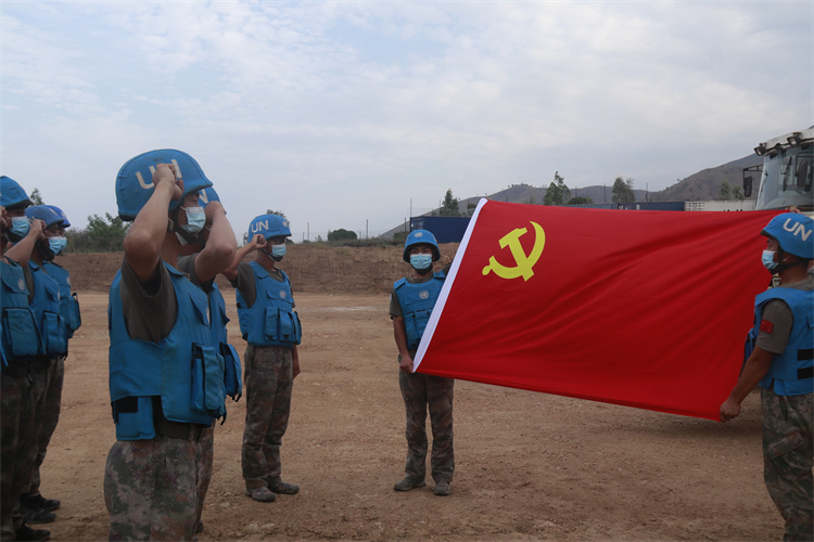 任務(wù)一線(xiàn)重溫入黨誓詞。中國(guó)第25批赴剛果(金)維和工兵分隊(duì)供圖 |