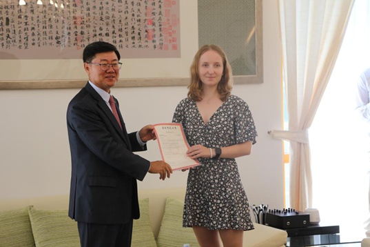 中國駐斯洛伐克大使孫立杰詳細(xì)詢問了同學(xué)們的漢語學(xué)習(xí)情況,并向兩名斯洛伐克學(xué)生發(fā)放了中國兩所大學(xué)的錄取通知書。