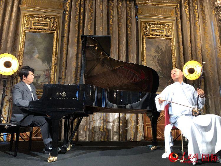 郎朗(左)在發(fā)布會上與二胡演奏家果敢合作演奏。人民網(wǎng)記者 劉玲玲攝 |