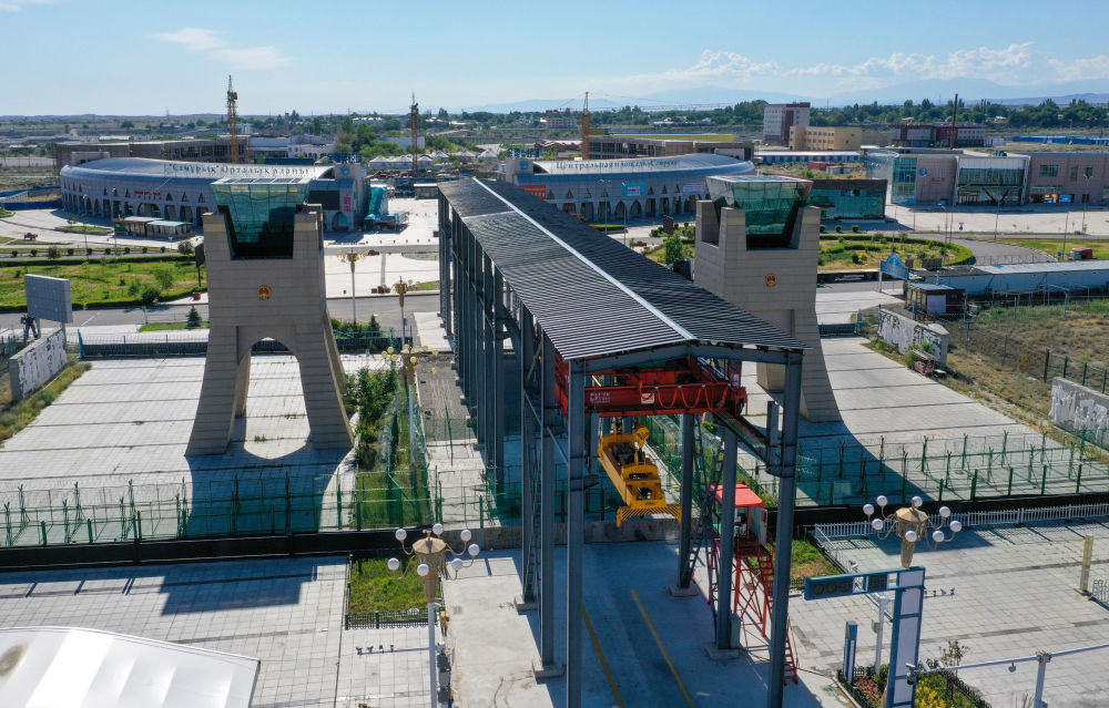 ↑中國(guó)新疆中哈霍爾果斯國(guó)際邊境合作中心的“空中陸橋”(2021年6月15日攝)。中哈霍爾果斯國(guó)際邊境合作中心搭建起“空中陸橋”,降低新冠肺炎疫情對(duì)跨境物流的影響。