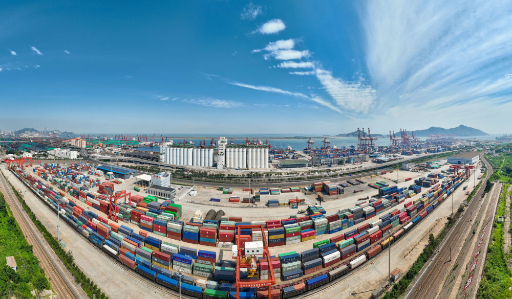 ↑中哈連云港物流合作基地及集裝箱碼頭(2022年8月7日攝,拼接照片)。中哈連云港物流合作基地為哈薩克斯坦產(chǎn)品提供了從太平洋揚(yáng)帆起航的出???。