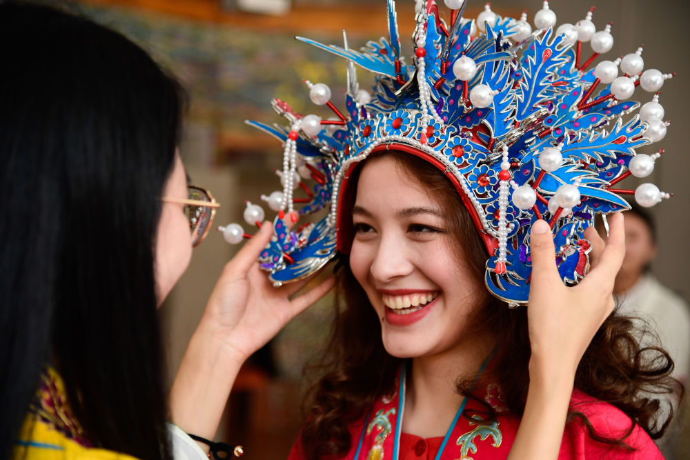 ↑在中國(guó)青島的中國(guó)石油大學(xué)(華東)大學(xué)生活動(dòng)中心,哈薩克斯坦留學(xué)生珍珠體驗(yàn)京劇文化(2018年5月3日攝)。