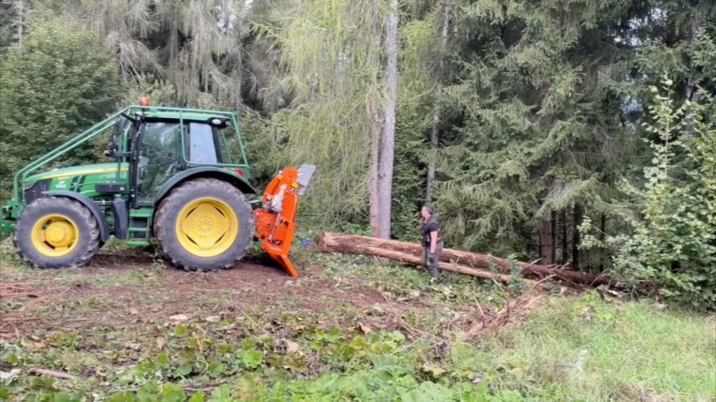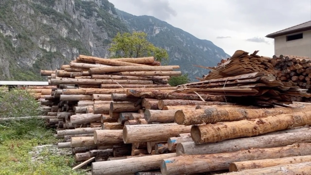 在意大利北部威尼托大區(qū)一處林場(chǎng),一臺(tái)拖拉機(jī)引擎轟鳴,正將一棵新砍斷的云杉從樹(shù)林運(yùn)至原木堆放區(qū),這里還存放著十余棵長(zhǎng)近20米的完整樹(shù)干等待運(yùn)輸。