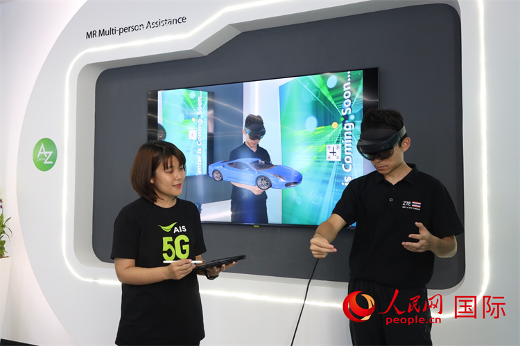 啟動(dòng)儀式現(xiàn)場(chǎng),AIS工作人員在演示MR+5G全息投影設(shè)備。人民網(wǎng)記者 趙益普攝 |
