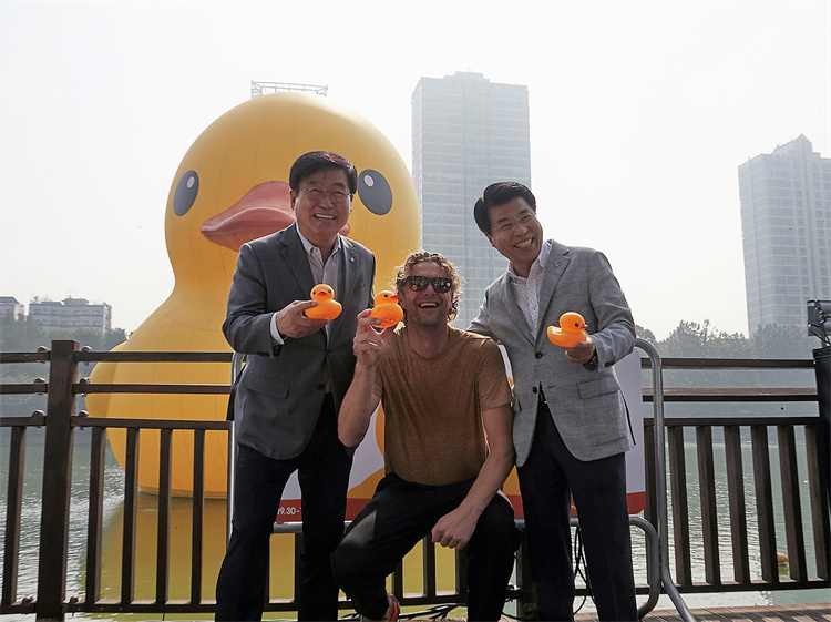 樂天物產(chǎn)代表理事柳濟敦(左)、首爾松坡區(qū)區(qū)長徐康錫(右)和弗洛倫泰因·霍夫曼出席“大黃鴨項目首爾2022 ”啟動紀念儀式。樂天物產(chǎn)供圖