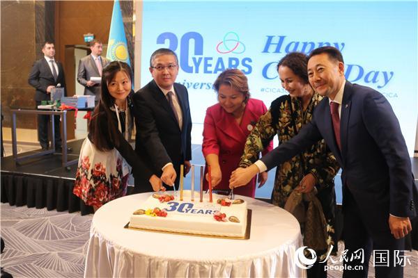 與會嘉賓共同慶祝亞信會議成立30周年。人民網(wǎng)記者 周翰博攝