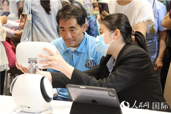 展覽會(huì)現(xiàn)場(chǎng),泰國(guó)民眾體驗(yàn)中醫(yī)藥最新診斷設(shè)備。人民網(wǎng)記者 趙益普攝