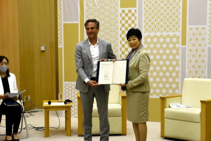 10月5日,東京都知事小池百合子(右)與FE首席執(zhí)行官雷格爾在東京都廳簽署備忘錄。(圖片來源:《朝日新聞》)