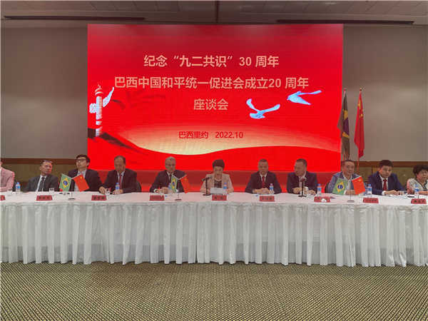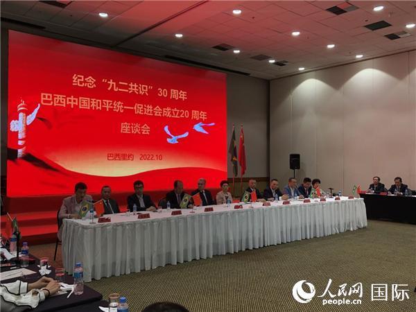 人民網(wǎng)里約熱內(nèi)盧10月9日電 (記者吳杰、畢夢(mèng)瀛)10月9日,紀(jì)念“九二共識(shí)”30周年暨巴西中國和平統(tǒng)一促進(jìn)會(huì)成立20周年座談會(huì)在里約熱內(nèi)盧舉行。中國駐里約熱內(nèi)盧總領(lǐng)事田敏、中國巴西和平統(tǒng)一促進(jìn)會(huì)會(huì)長王俊曉、巴西中國問題研究中心主任羅尼·林斯及里約主要僑團(tuán)負(fù)責(zé)人、留學(xué)生代表、臺(tái)胞代表等出席。