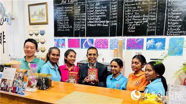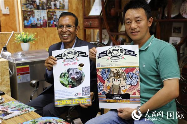 10月11日,東帝汶總理魯瓦克與帝力全盛AR咖啡店老板陳麗松推介東帝汶貓屎咖啡。人民網(wǎng)記者 孫廣勇 攝